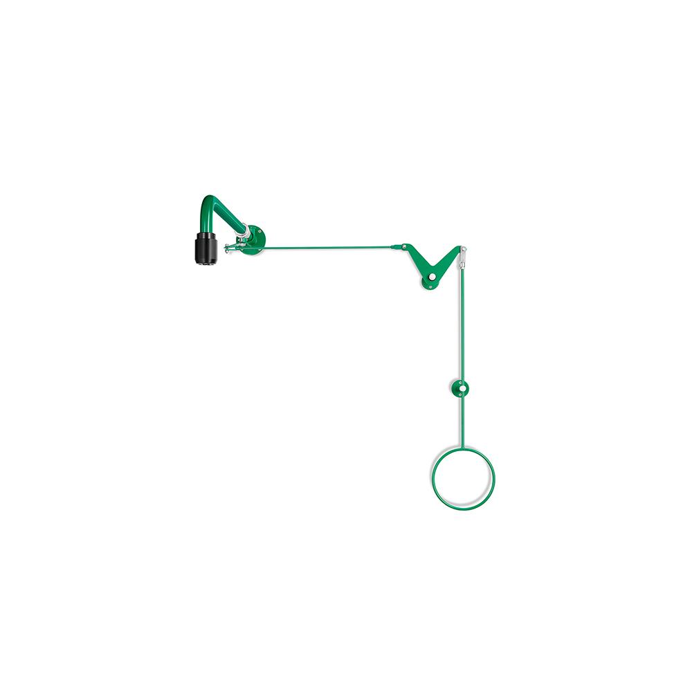 - La doccia di emergenza per il corpo è progettata per il montaggio a parete e dispone di una flangia a parete in acciaio inossidabile con quattro fori di fissaggio. La superficie è verniciata a polvere verde resistente agli agenti chimici. L'allacciamento all'acqua avviene tramite filettatura interna da 3/4". Un tubo di collegamento in acciaio inossidabile lungo 75 mm (3/4"), anch'esso verniciato a polvere verde resistente agli agenti chimici, collega i componenti. Il Rubinetto a sfera integrato in ottone resistente alla dezincatura è testato e omologato DIN-DVGW. L'attivazione avviene tramite un tirante con deviazione tramite un angolo con supporto a parete (lunghezza 510 mm). Il montaggio è possibile a scelta a destra o a sinistra di una porta.