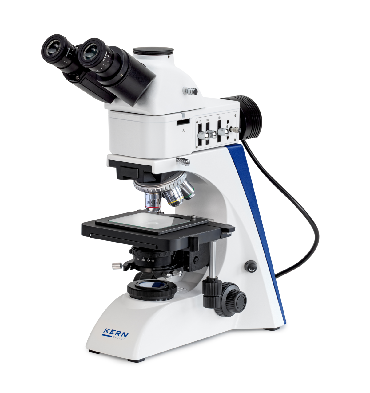 • Questo microscopio professionale e versatile è dotato di un piano di lavoro e di una semplice unità di polarizzazione composta da analizzatore, polarizzatore e filtro blu.