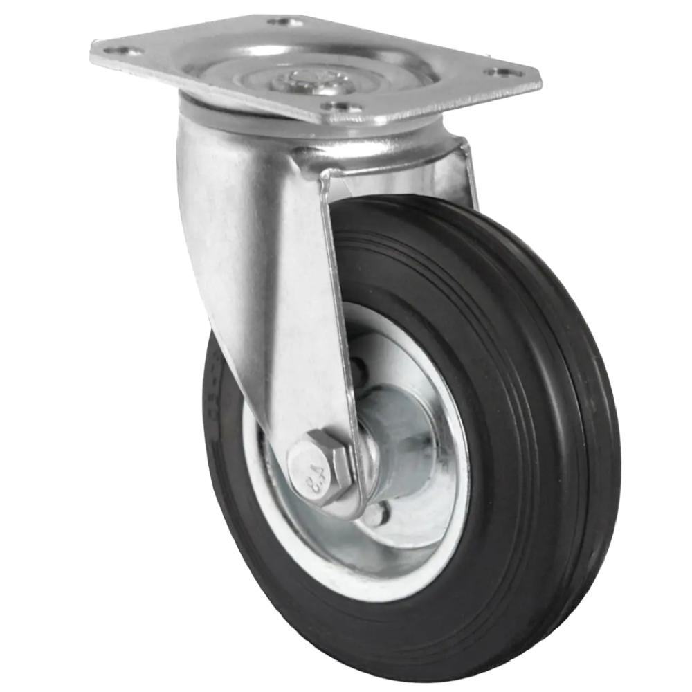 - La rotella orientabile è costituita da una ruota elettricamente conduttiva con corpo in lamiera d'acciaio zincata blu e battistrada in gomma piena nera con una durezza di 85° Shore A.