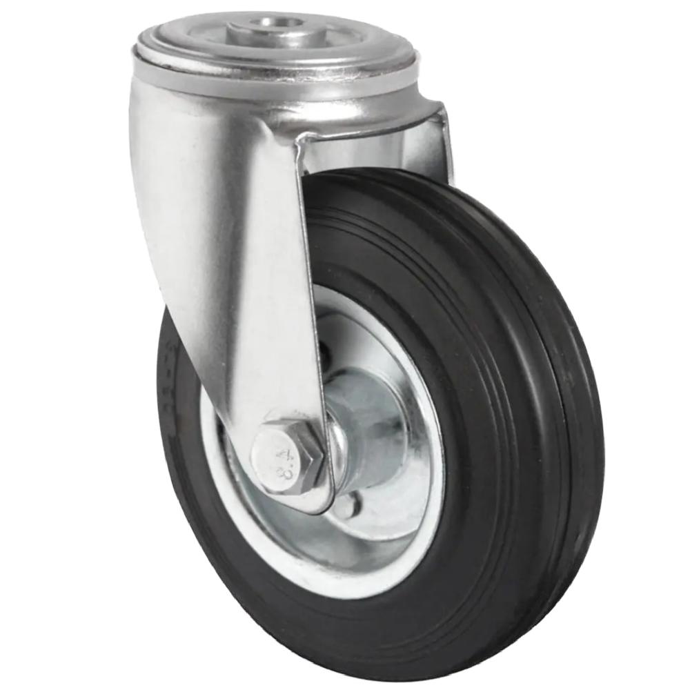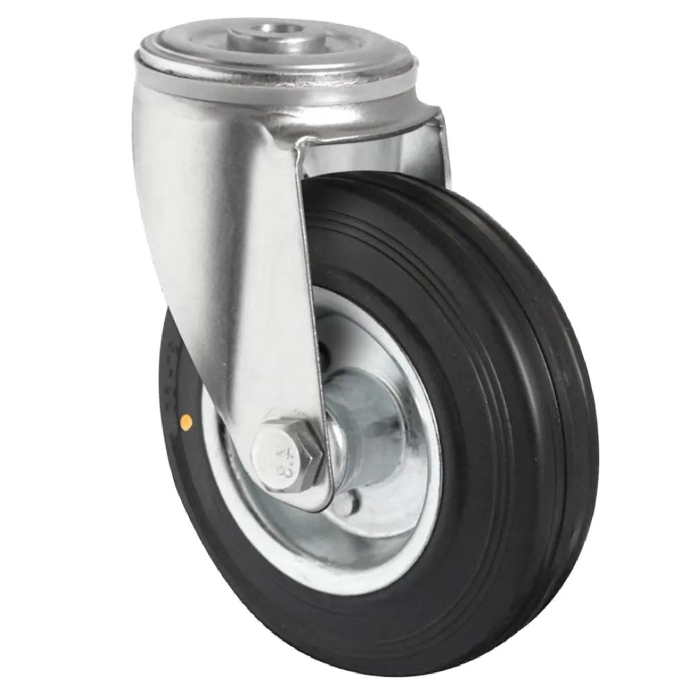 • La rotella orientabile con foro posteriore è costituita da una ruota elettricamente conduttiva con corpo in lamiera d'acciaio zincata blu e battistrada in gomma piena nera con durezza Shore A di 85°.