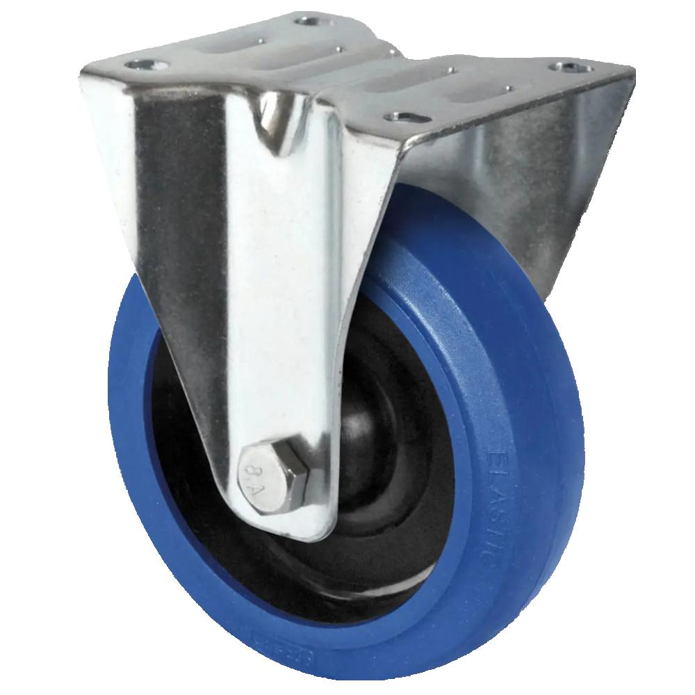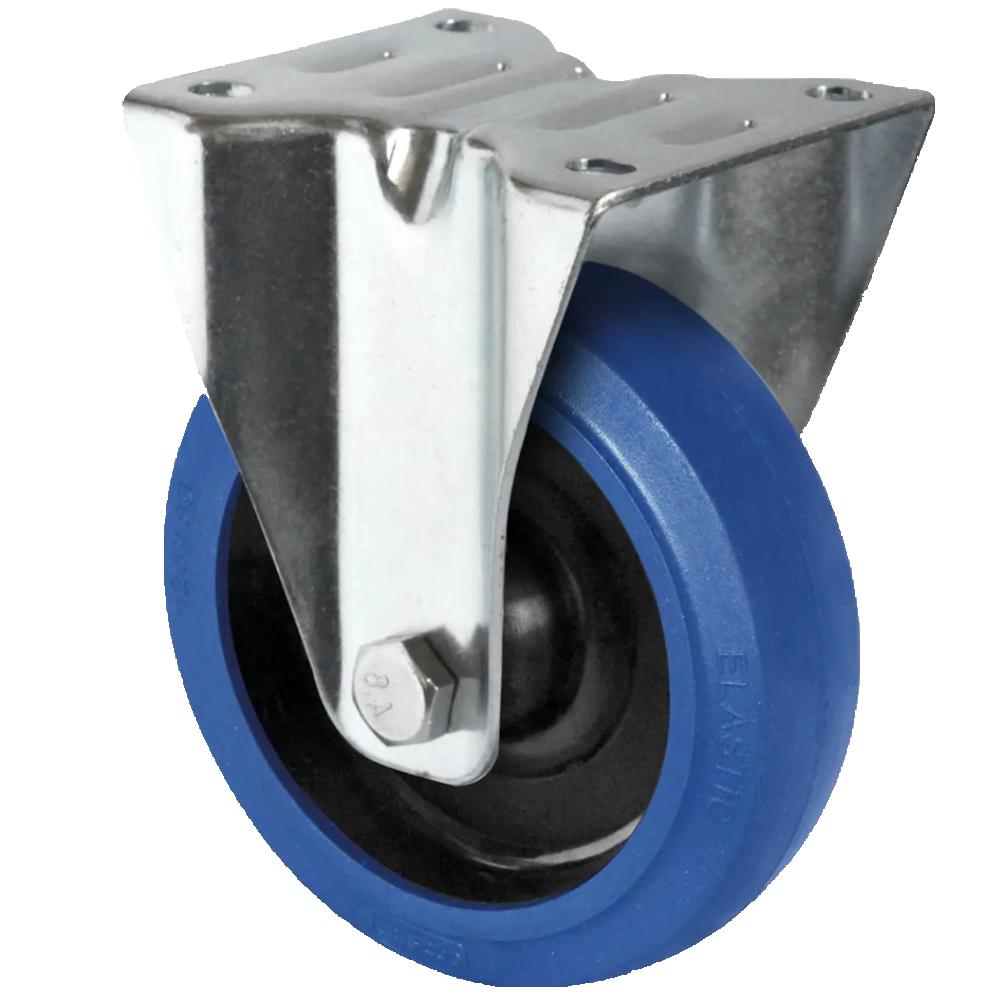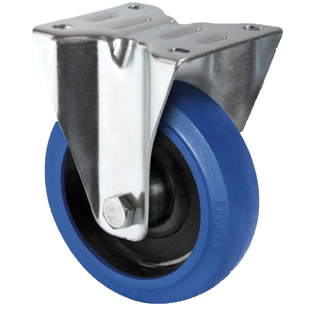 - La rotella fissa è una robusta rotella da trasporto con corpo ruota in poliammide nera, battistrada elastico in gomma (75° Shore A) di colore blu e alloggiamento in lamiera d'acciaio zincata.