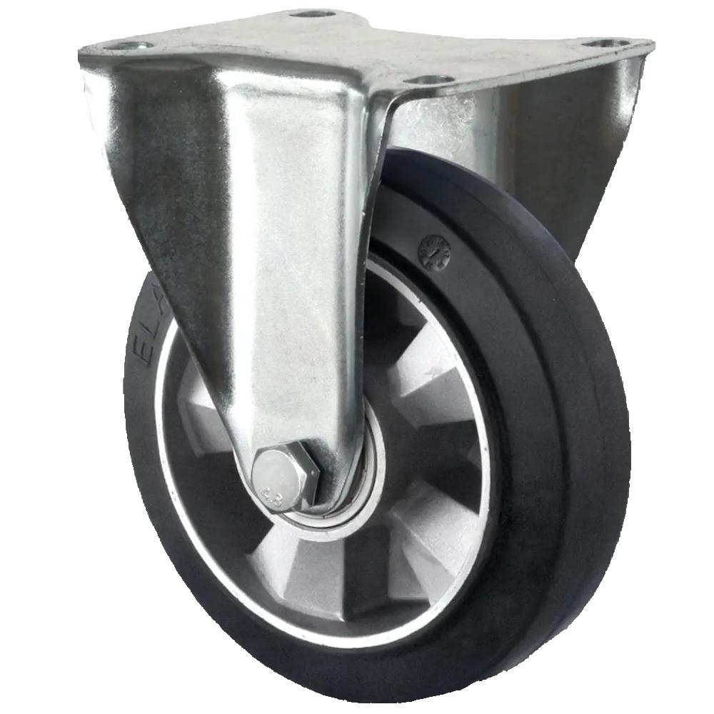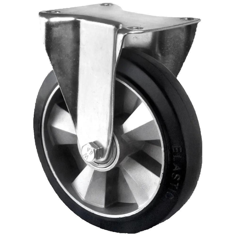 • La rotella fissa è una rotella per carichi pesanti con corpo in alluminio e battistrada elastico da 70 a 75 Shore A in modello nero, con larghezza della ruota di 50 mm e diametri da 125 a 200 mm.