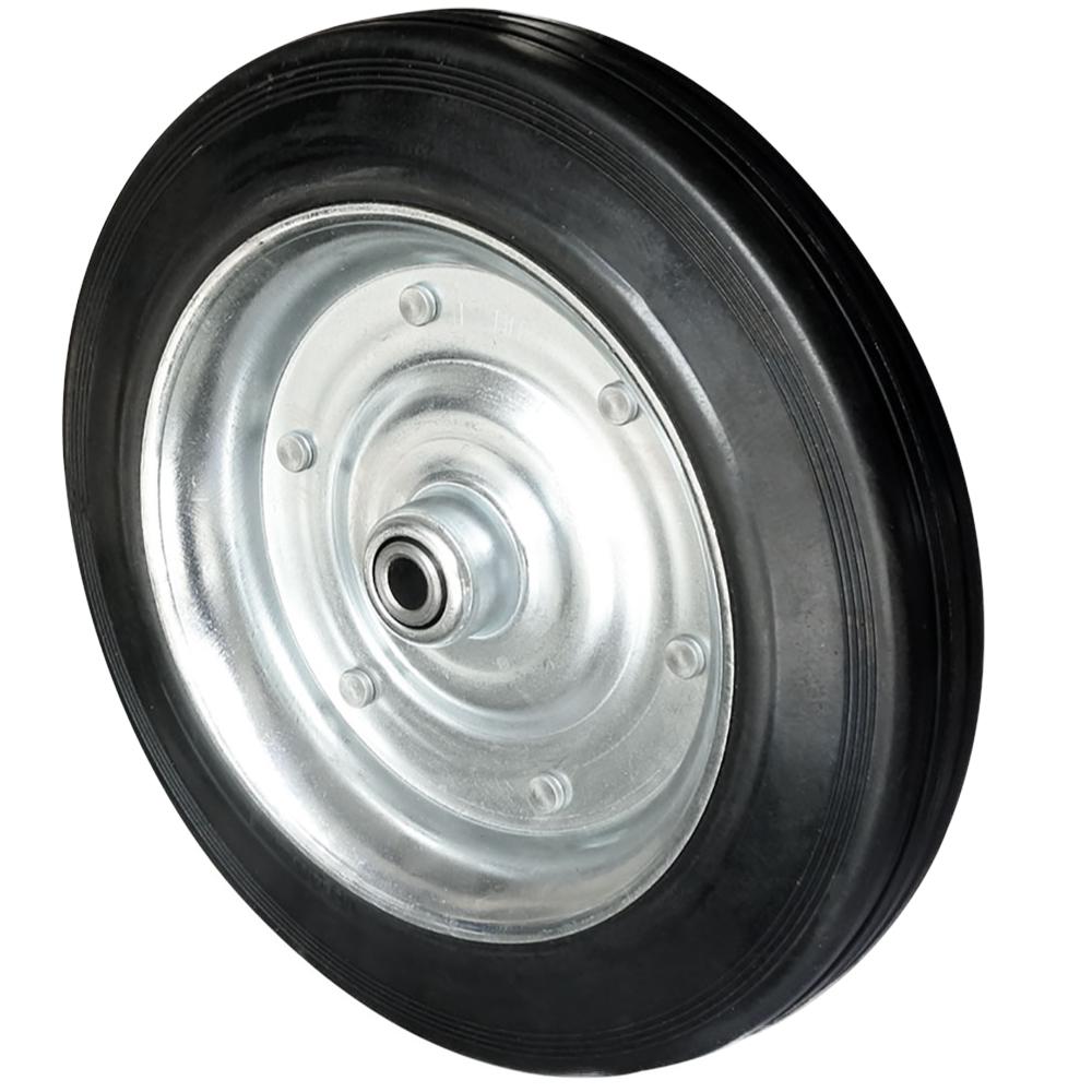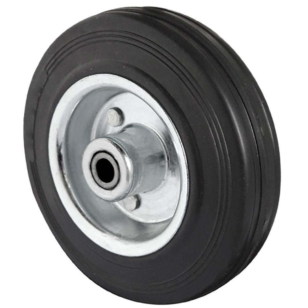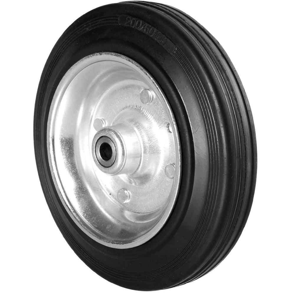 - La ruota è una robusta ruota da trasporto con corpo in lamiera d'acciaio zincata blu e battistrada in gomma piena (85° Shore A) di colore nero, progettata per un'elevata resistenza meccanica e una marcia ammortizzante.
