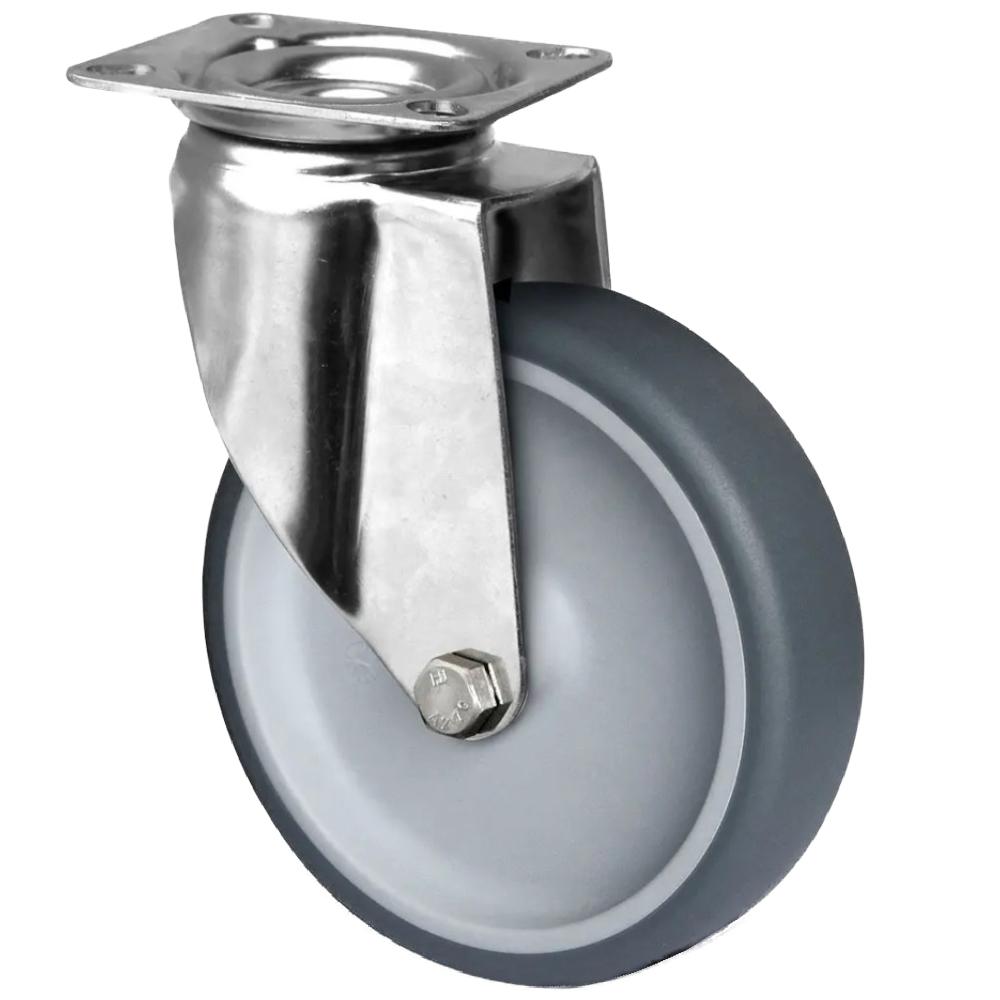 • La rotella orientabile è composta da una ruota con corpo in polipropilene grigio e da un battistrada grigio in elastomero termoplastico con una durezza di 95° Shore A.