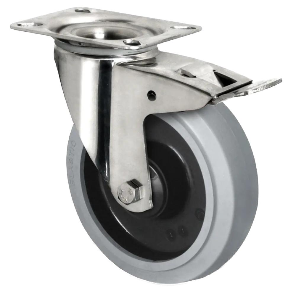 • La rotella orientabile in acciaio inossidabile con freno totale è composta da una ruota con corpo in poliammide nera e un battistrada elastico grigio con una durezza di 65° Shore A.